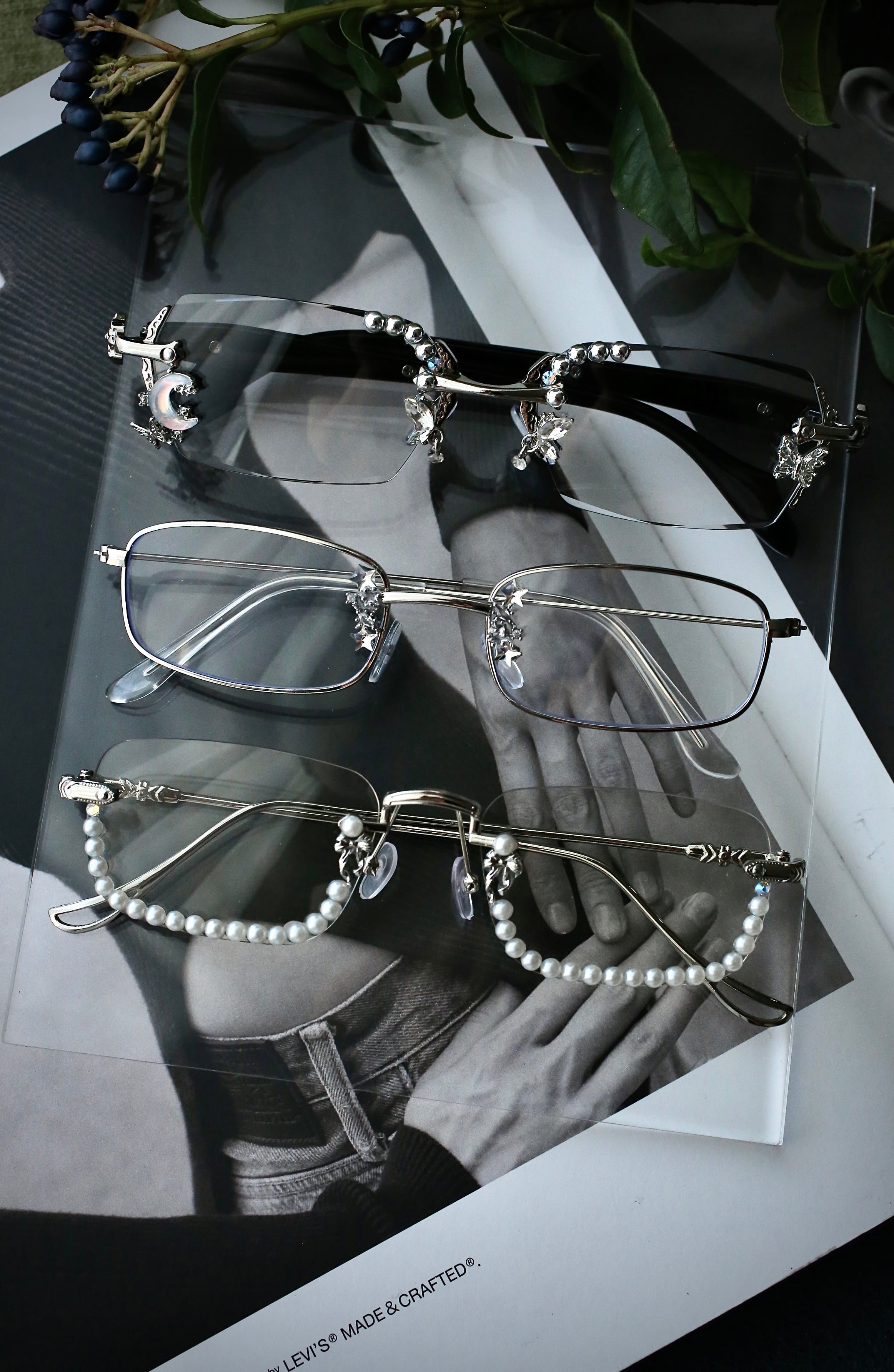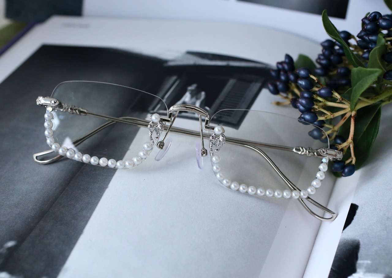 掛けるだけで一気に映えるファッショングラスができました。こちらはアンダーをパールで埋め目頭には小さなリボンときらめく小さなビジューがポイントです。