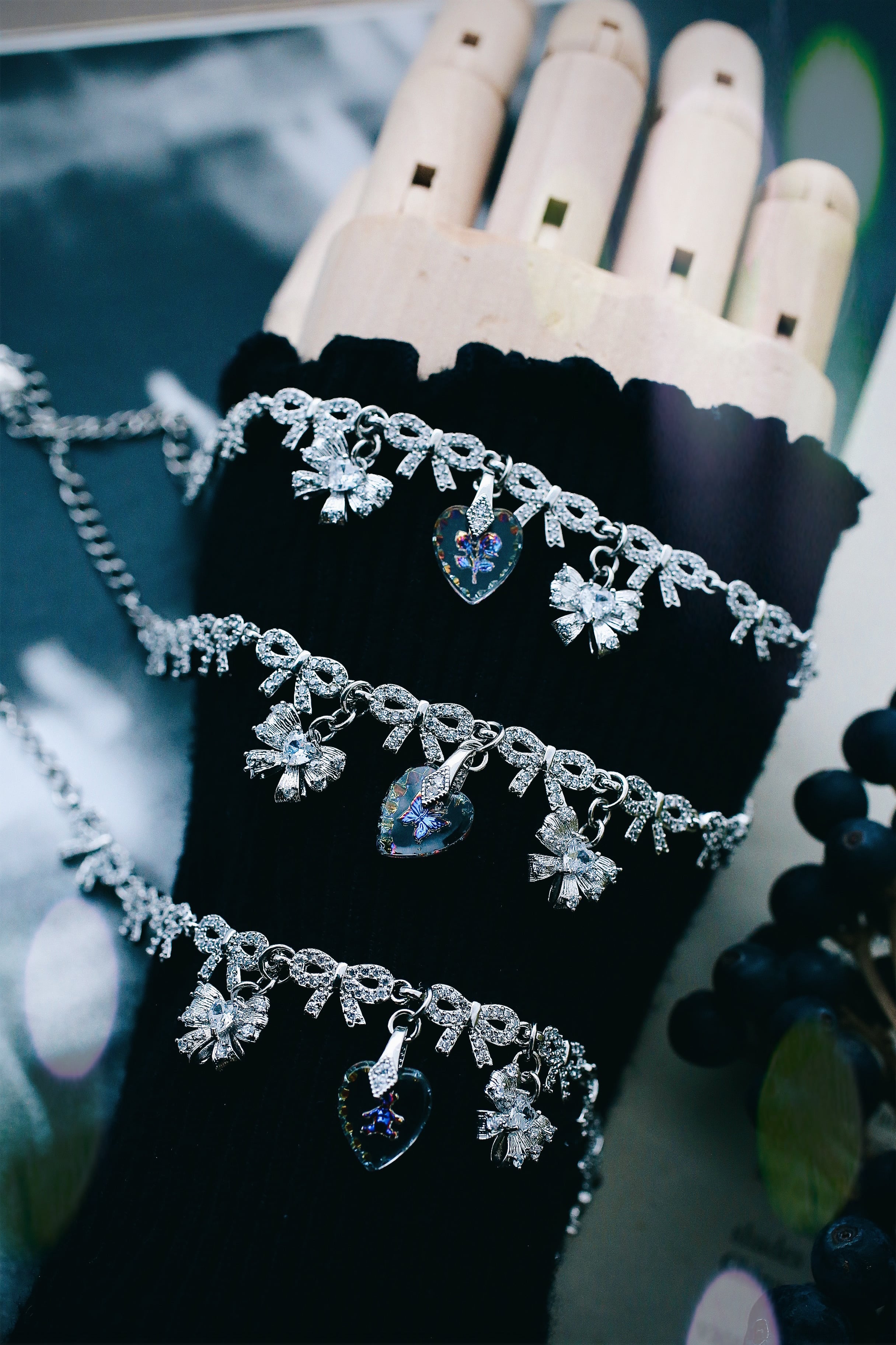 キラキラとジルコニアきらめくリボンのチェーンにさらにリボンがゆらゆら⋆ ̥ ꙳✴︎さらに中央にはドイツ製ヴィンテージのハートガラスが輝くブレスレット。愛らしいデザインですが、オールシルバーでまとめて大人っぽさが漂うデザインに仕立てました。