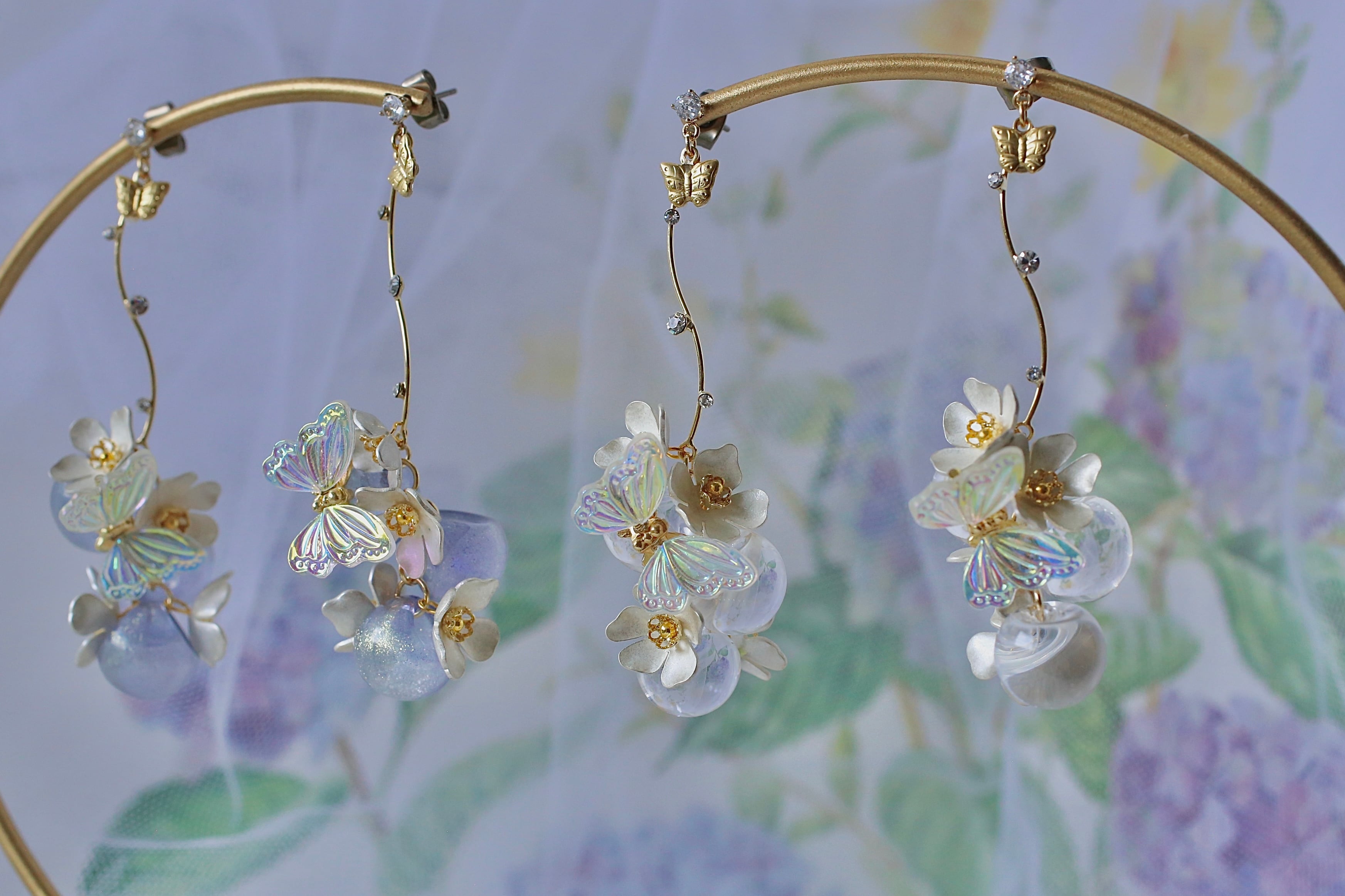 まるで水滴のようなクリアドロップにゆらゆらとオーロラ色の羽根が輝く蝶々と