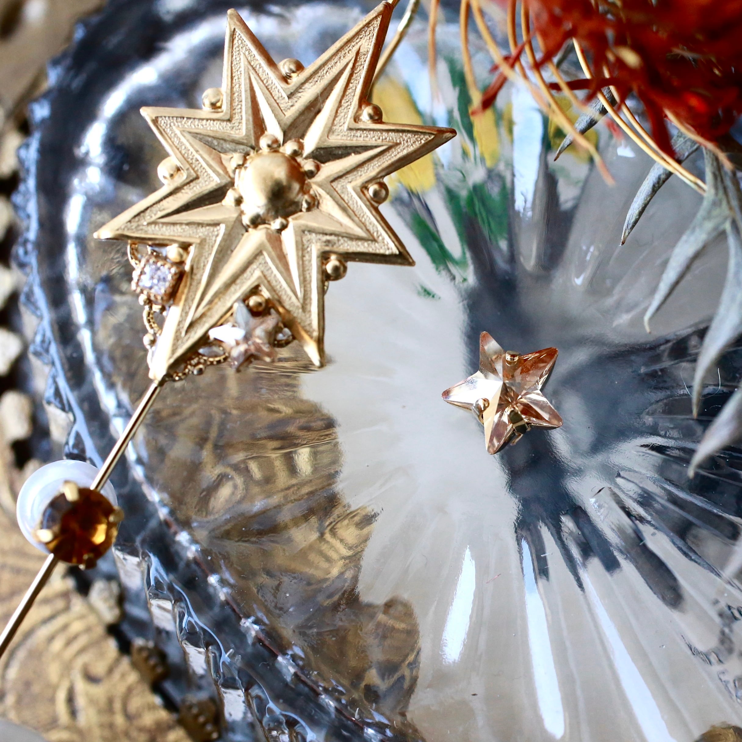 遊びごごろのある真鍮製の星やスワロフスキーの星がポイントのイヤーフックです。