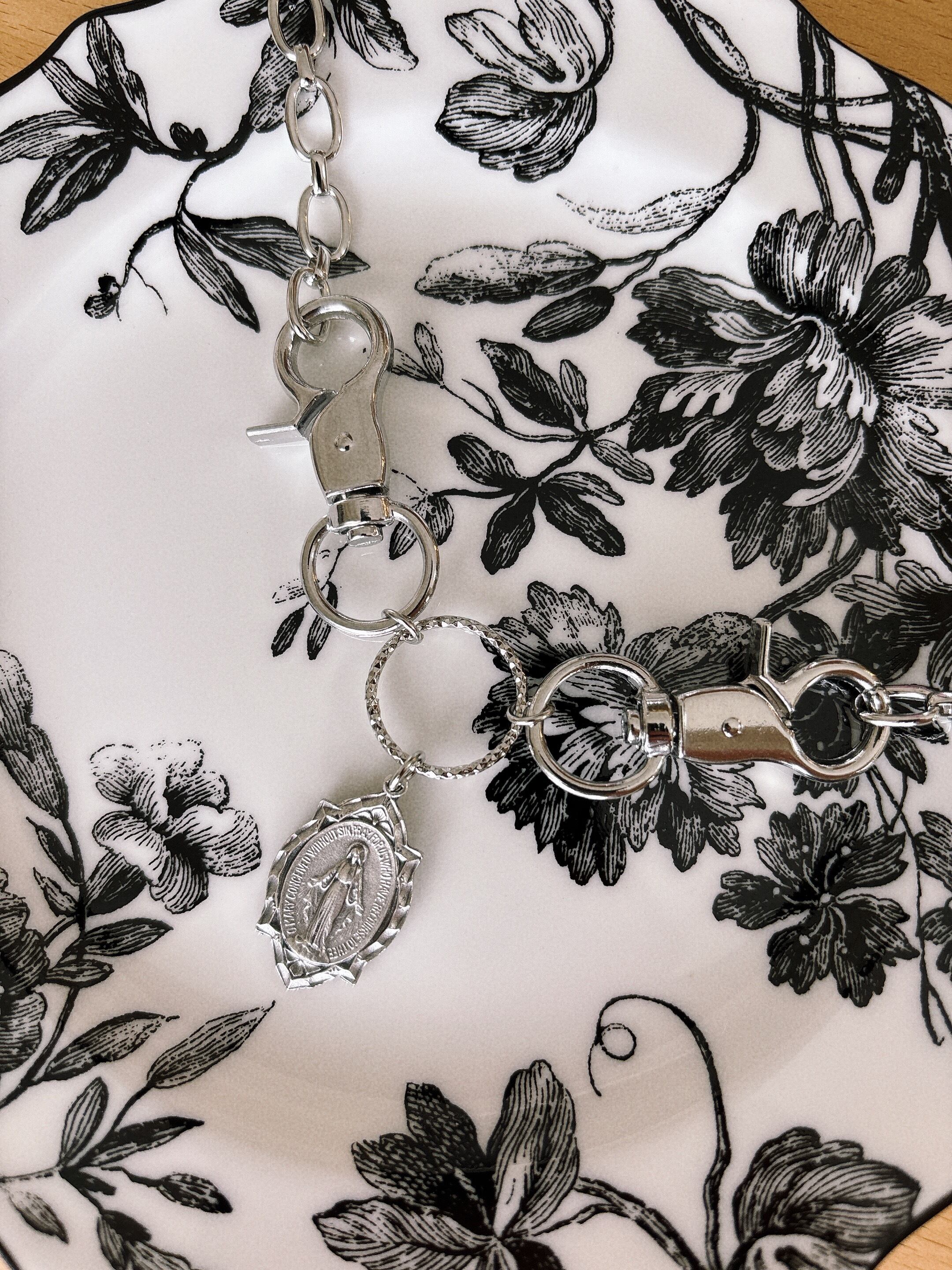 両面に美しい細工が施されたメダイが美しく彩りを添えます。